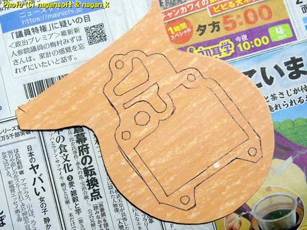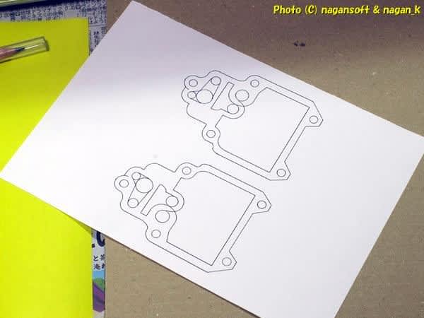 ケント紙バージョンでそこそこ満足できる状態(不満箇所はあるが私の手先ではこのあたりが限界です)になったので、ケント紙バージョンを型紙にしてガスケットシートにトレースします。