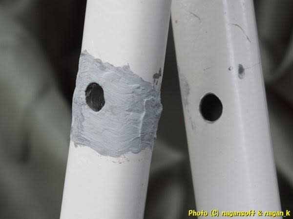 タープテントです。骨が折れたところを継いで取付穴開けて錆止め塗料塗ったところまで進んでます。