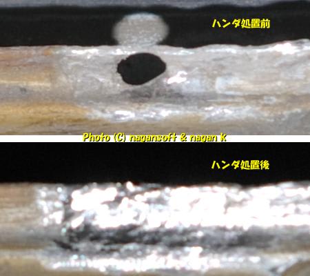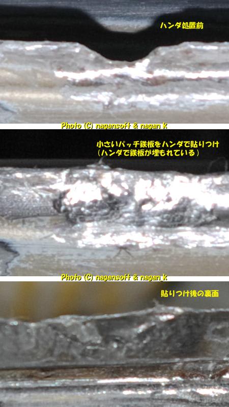 面積が小さいので貼りつけたパッチ鉄板がハンダに埋もれてますが、がっちり貼りついてます。