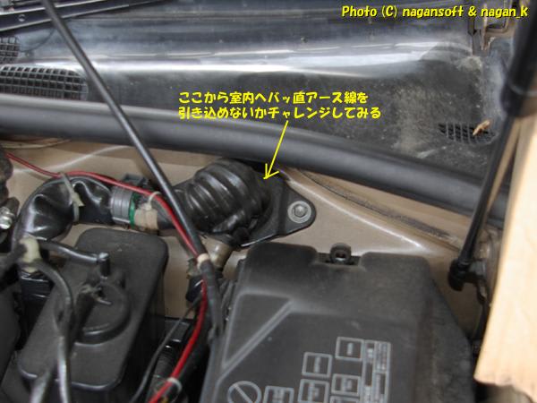 で、エンジンルームからアース線を室内へ引き込むルートを考えます。