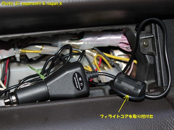 電源ケーブルのシガーライターカプラ側にノイズ対策でフィライトコアを取りつけました。