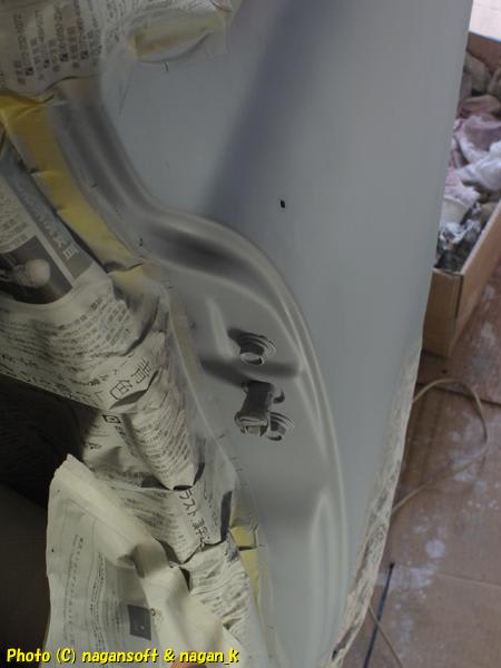 ドアストライカー周辺のスポット溶接跡にサビが出ていたので、サビ取り研磨した上でパテ整形しています。