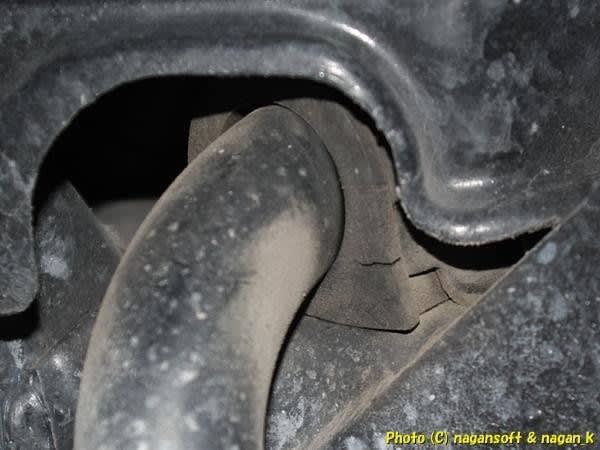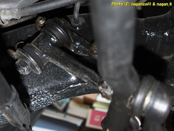 ネットで調べた情報では、ロアアームのブッシュがへたれてくるとアームを隙間センターに維持できなくなりステアリングを一杯にきったりしたときに前後のフレームに干渉する。干渉する部位が一緒なのでそこは塗装が剥げており半年もしたら錆が出ている。というもの。