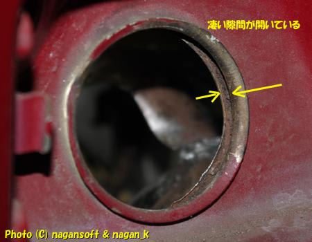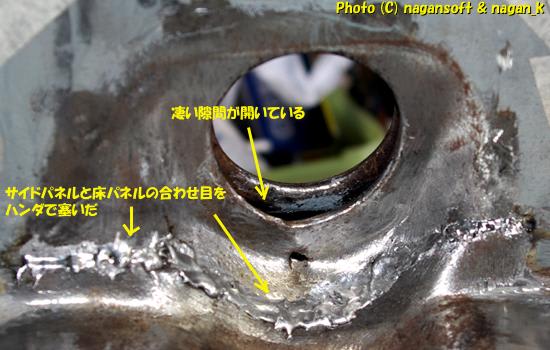 そこが歪んでいて指が横に3本入るぐらいの大穴が開いてました。ちょうどガソリンタンクの給油口が通る穴部分」内部のパネル合わせ箇所で、何の処理もされずに穴が開いたままだったのです。
