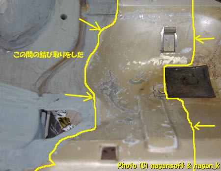 作業を元に戻って、リヤシート座席下の錆び取りです。その一部分をしました。