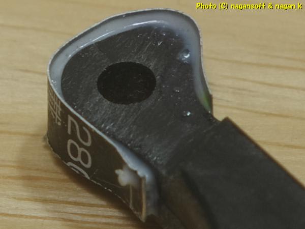空き缶パッチをちょっと大きめに切り出してボンドしたので、こんな形で硬化します。もちろん期待どおりです。