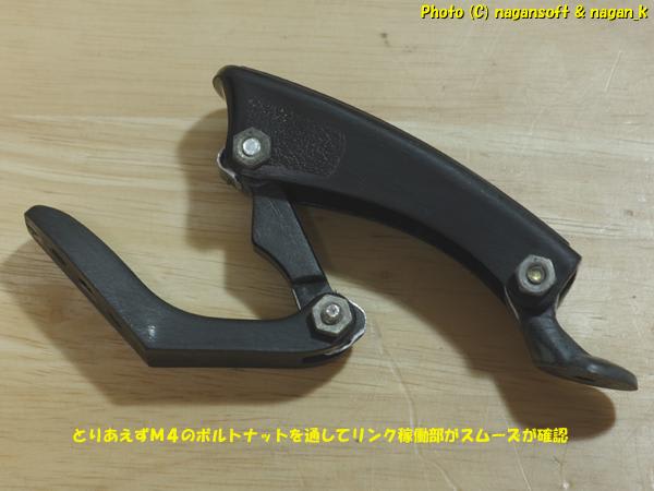 なので、もちろんリンク稼働がスムーズなはず。念のためにM4のボルトナットを通して稼働確認しました。(本当はロールピンでテストすべきですが、ロールピンの抜き差しは古い樹脂素材へのダメージが大きそうなので最終組み立ての1回だけにするつもりです)