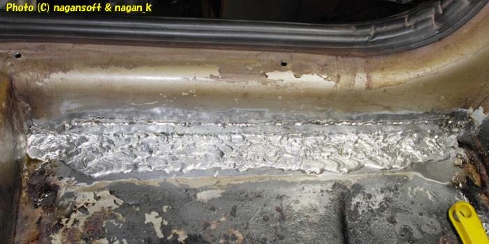 このメインパッチピースを貼るまで、サイドシルがクシャって歪まないかすごく心配だったのよ。