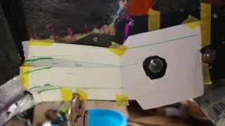 本日のスバル弄りは2時間30分でした。前回で作った型紙がなにかおかしいなーと思っていた件です。強度出しリブ折のセンターが固定ボルトの延長線上にないからというのに気づきました。ついてはリブ折りの位置をやり直しました。ボルト通し穴のほうへ型紙を延長していきます。リブ折りのデザインはこんな感じで型紙生成です。この型紙を鉄板に写し取ります。ブリキバサミで切り出してドリルで穴開け加工してこんなのになりました。ここで本日のタイムアップです。しかし暑いよ。あまりに暑いと途中で作業がストップ...